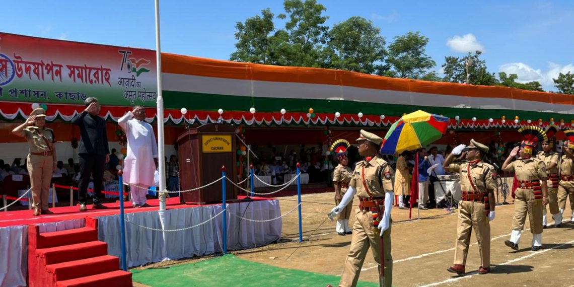 শিলচর : দেশের অন্যান্য অংশের সঙ্গে সোমবার কাছাড় জেলায় দেশের ৭৬ তম স্বাধীনতা দিবস পালিত হয়েছে। এ উপলক্ষে শিলচরের পুলিশ প্যারেড গ্রাউন্ডে আনুষ্ঠানিকভাবে জাতীয় পতাকা উত্তোলন করা হয়। ৭৬তম স্বাধীনতা দিবস উপলক্ষে কাছাড় জেলার কেন্দ্রীয় অনুষ্ঠানে পুলিশ প্যারেড গ্রাউন্ডে জাতীয় পতাকা উত্তোলন করেন পরিবহণ, আবগারি ও মৎস্যমন্ত্রী পরিমল শুক্লবৈদ্য।